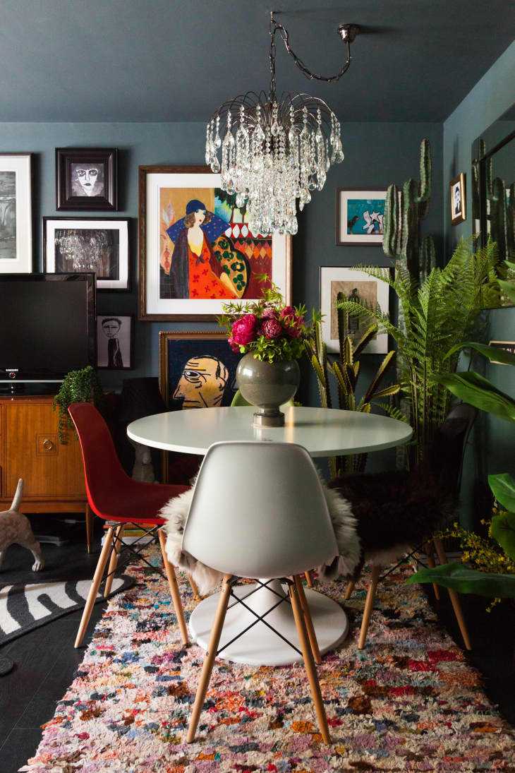 If you were banned from eating meals in front of the television as a child, this setup may seem a little shocking to you. But in a small space, having a separate dining room generally isn’t the norm. In that case, know that it’s more than okay to carve out an eating area of your own, complete with a gorgeous chandelier over the table, even if said setup encroaches on what you’d consider your living room proper—and the TV is in full view. Simply use separate rugs to help define one space from the other, as seen in this London flat . And consider a compact round dining table, too, which disrupts the flow of the rest of the space less than a table with sharp angles and corners will.