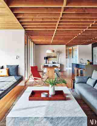 In the living area, a custom-made cushion creates a reading nook. Arne Jacobsen sconce; marble plinth cocktail table by RH ; NYChair x by Takeshi Nii.