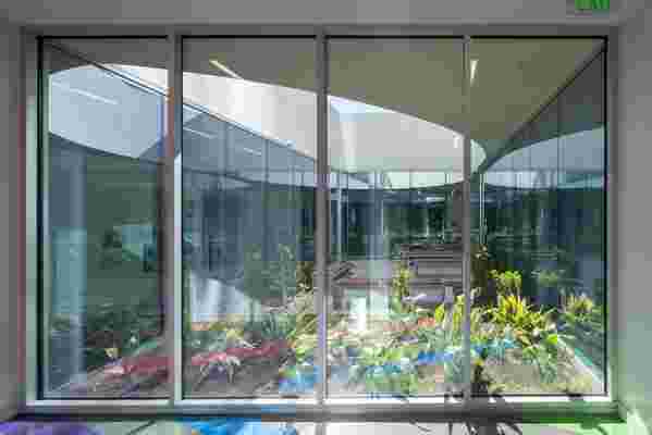 With a complex, multifaceted program and desire to give the Center street presence, the Leong brothers turned to designers Le Corbusier and perhaps surprisingly, Frank Gehry , for architectural inspiration. “We set out to create a porous but connected campus that oscillates between inside and outside to take advantage of the California environment,” Dominic describes. For scale, they looked at the Spanish Colonial courtyard houses typically found in Hollywood. And for institutional context, they thought about the mat building, a horizontal structure punctured by courtyards and championed by Le Corbusier in projects like the 1965 Venice Hospital. A stucco exterior on the ground floor with glass extrusions above was inspired by Gehry’s early residential work in L.A. vernacular.
