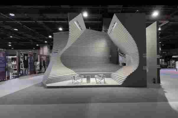The system features widely distributed folded skin made of glass reinforced concrete (GRC) and steel frame. The duo-purposed exhibition pavilion sample here is only 24 sqm. The height of the platform can be set, but we suggest promo materials are placed at seat level. When used outdoors, a cantilevered roof helps block the sunlight.